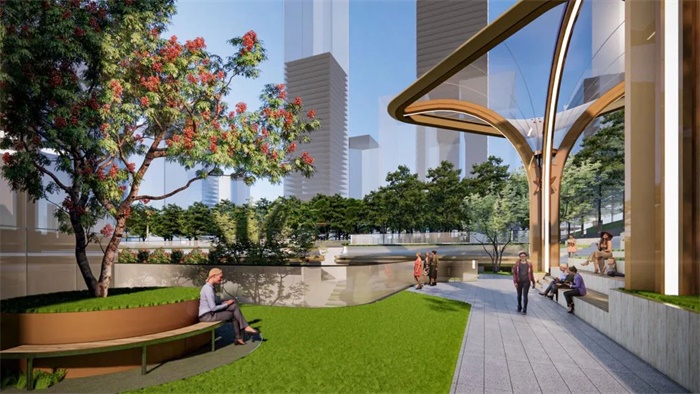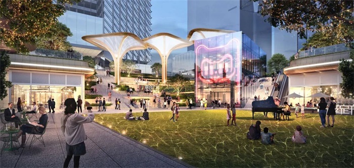 从城市空间的尺度、都市生活的品质出发,项目打造公众性、开放性及生态性的宜人下沉广场;通过光影、雾喷等技术手段布置地标艺术构筑物;构建能够在商务区建设中起到标杆作用的“低碳”环保循环系统。
