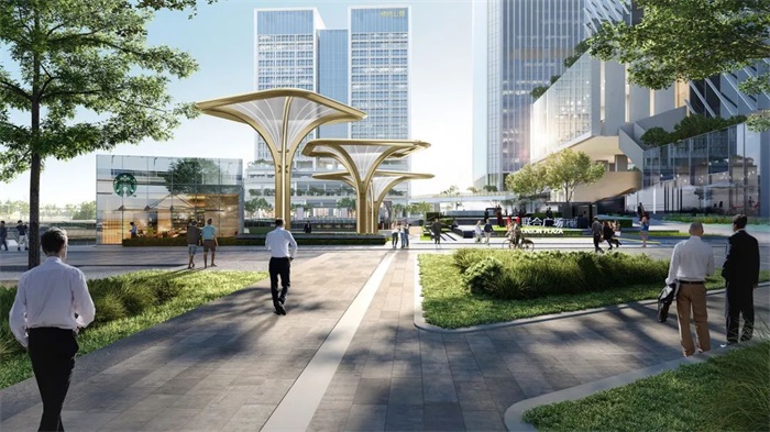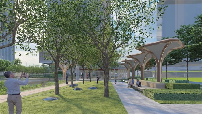 本项目景观以线性元素为设计语言,通过列植的乔木及片植的灌木强调地块的整体性及轴线感,形成舒朗简约的绿化空间,不仅让身处其中的游人感受到自然、轻松浪漫,也为高处塔楼的办公人员提供新鲜的视野,满足城市的多元需求。