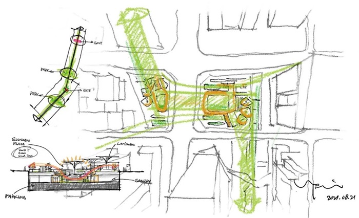 在进行项目的实地考察时,我们能见到的是一块不大的、下凹的场地。结合周边的中央公园、元美公园以及地块本身的政策定位、区位条件,我们清晰地感知到:这是一块蕴含极大能量、将来可为城市提供更多可能性的地块。所以,设计时,我们考虑利用“地上公园+地下配套”的开发模式提升土地利用价值,设置可承载大型节庆活动、日常休闲放松的弹性下沉空间。我们希望通过这种模式将公园、城市、居民进行融合,柔化城市生活边界,使人们心中拥有心驰神往的一方之地。