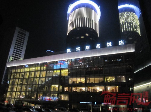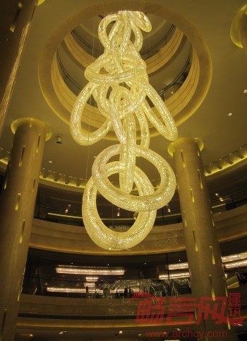 酒店建筑最迷人的地方是它的公共空间,有它奢华威严的一面,也有它好客亲切的一面。为了实现这一目的,在原有建筑的西立面增加了一个南北长约52米,东西宽约27米、高25.8米的三角体做为酒店的公共核心区——大堂,面积约794平方米。在大堂空间内,二层的圆形天桥、三到五层的圆形挑空和自上垂下的环形水晶雕塑环环相扣,天花也采用了同心圆的灯带,这一组圆的造型成为了大堂的中心。大堂南侧是一组直达五层宴会厅的大扶梯,行进其上,室内大堂景观和室外广场景观交相辉映,甚为壮观。