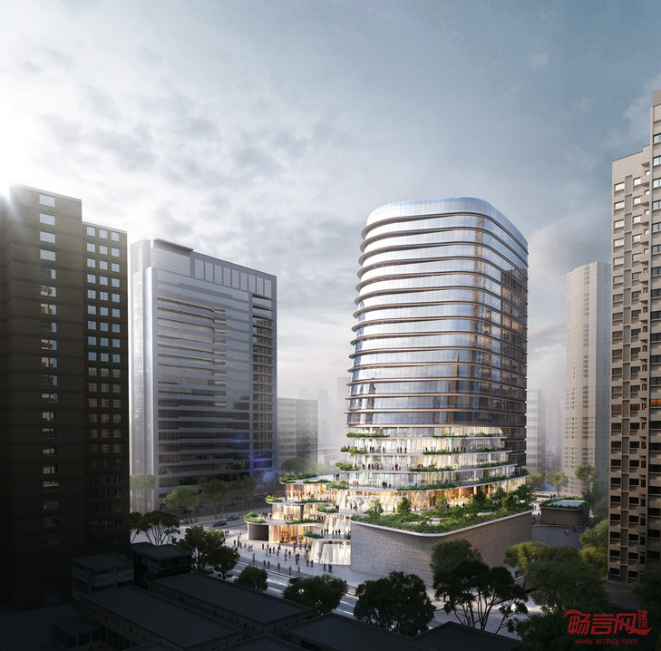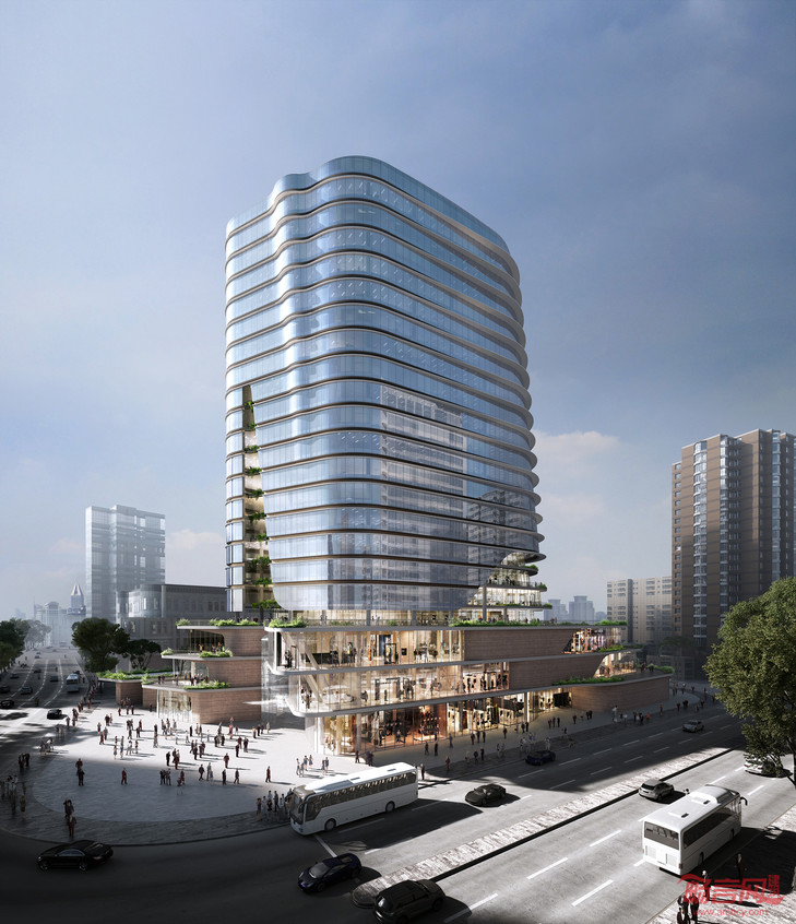 塔楼的方位和角度充分考虑视野最优化,在长寿路沿路打造引人注目的建筑形态。为凸显建筑在主干道的可视性,塔楼正立面幕墙向顶端弯曲形成一道道轻柔涟漪,柔和了周边建筑物的映像。下方凹进式的“洞穴”则减小了建筑大体量的视觉冲击,并将下方的平台融入塔楼中。朝南紧凑的横向挤压结构,减少了对办公楼层的阳光直射。玻璃幕墙运用高性能、节能、低辐射、低铁的玻璃材料。裙楼平台的自然景观不仅使绿化面积最大化,同时减少了建筑的阳光直射,并保证流畅的自然通风。 (项目渲染图版权:AsymmetricA)