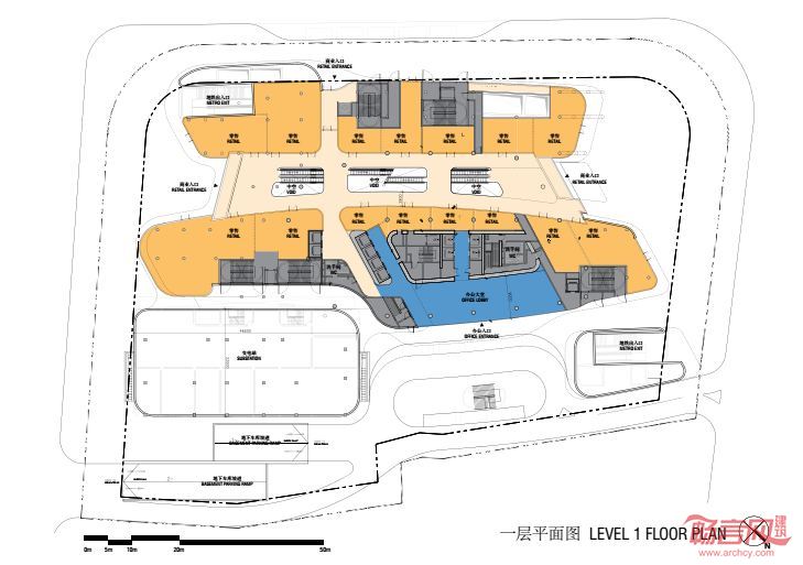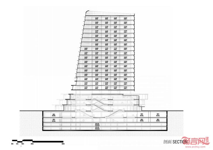商业零售裙楼从塔楼延展到地块边界,葱郁的绿植平台成为南部绿地的延伸。两端的商场入口清晰可见,面向熙熙攘攘的步行街交叉口,并通往两个地铁站入口。建筑的低层部分高度通达,为城市肌理注入久违的以人为本的设计考量。塔楼形态向上缓慢伸展,同周围环境和天空柔和融为一体。其形态、连结方式及柔和感,使塔楼如同云朵飘在山间般,浮于购物中心的绿植平台之上。