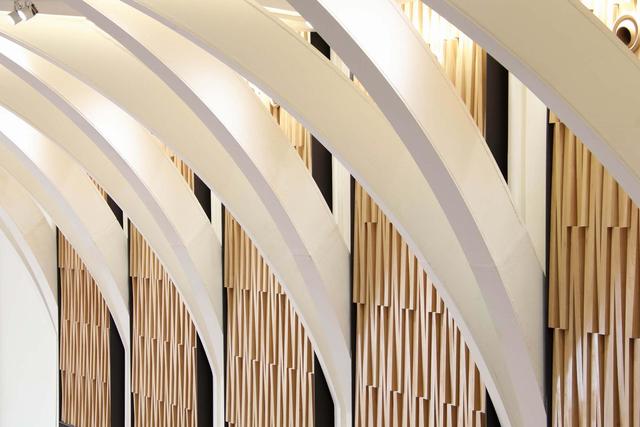 大跨距的无柱空间是以哥德式教堂拱顶结构为概念,转化以现代钢结构表现,并整合天花与灯光设计,重新诠释哥德式建筑中的肋状拱顶,塑造学院特有之礼拜空间。