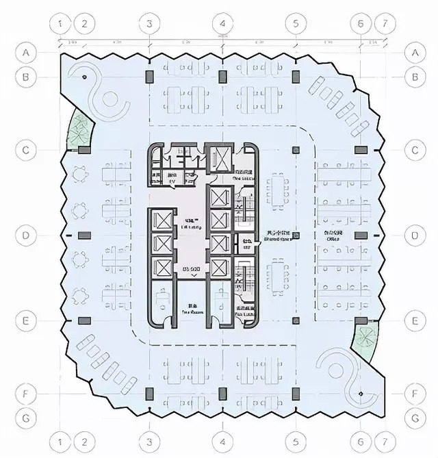 在标准的办公层中,核心筒布置于平面的正中心,办公空间围绕四周布置,最大化地将四周景观引入办公中,也能够使得整体空间能够有足够的采光。也形成了灵活开阔的办公空间,符合不同功能与业主的需求,基于此平面的布置,办公使用率可达82.6%。