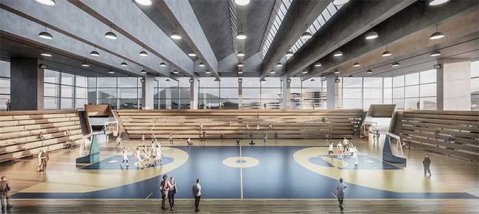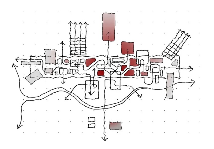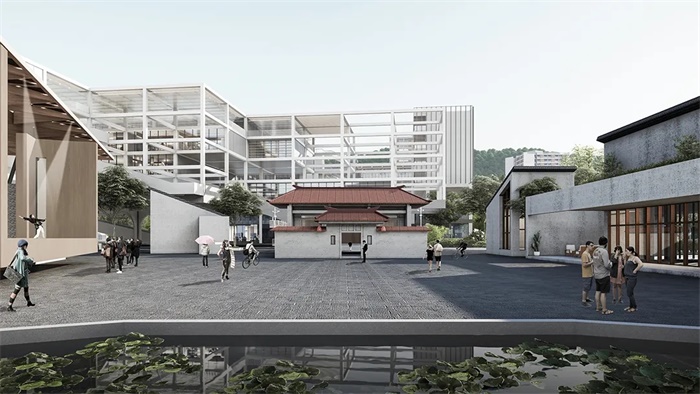 校园的共享中轴延山谷方向展开,定位了整个科教走廊的城市共享核心。结合合场地原有道路,将图书馆、校园活动中心、食堂、医院、公共教室等校园中最公共的功能和空间解构并整合为一个“微缩城市”, 组织整个校园的公共空间骨架,提供城市生活般复合、高效的校园体验。