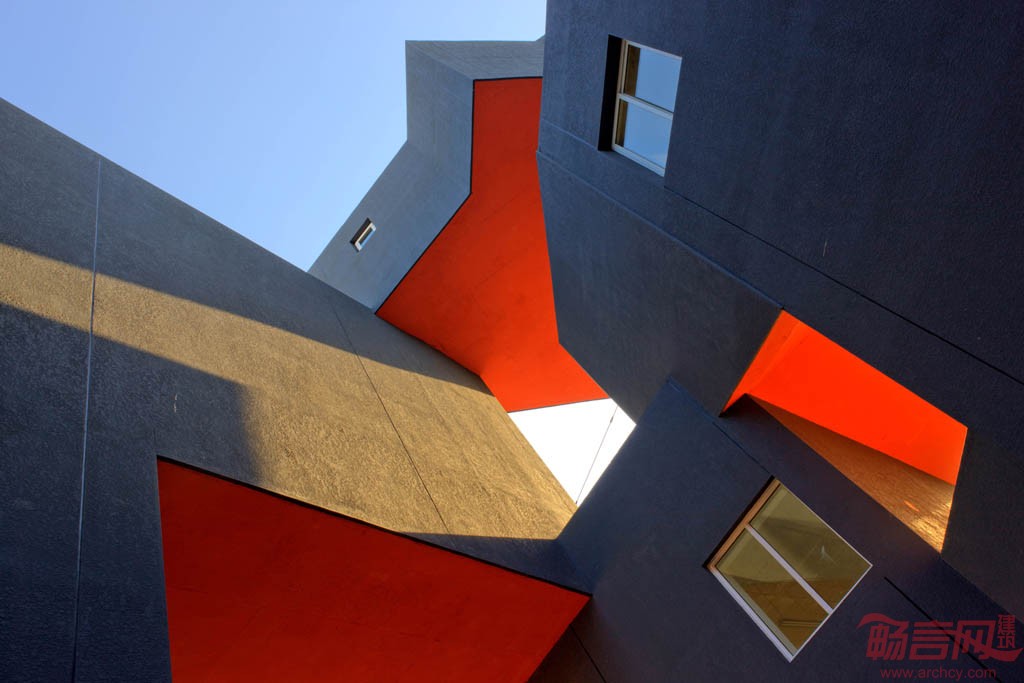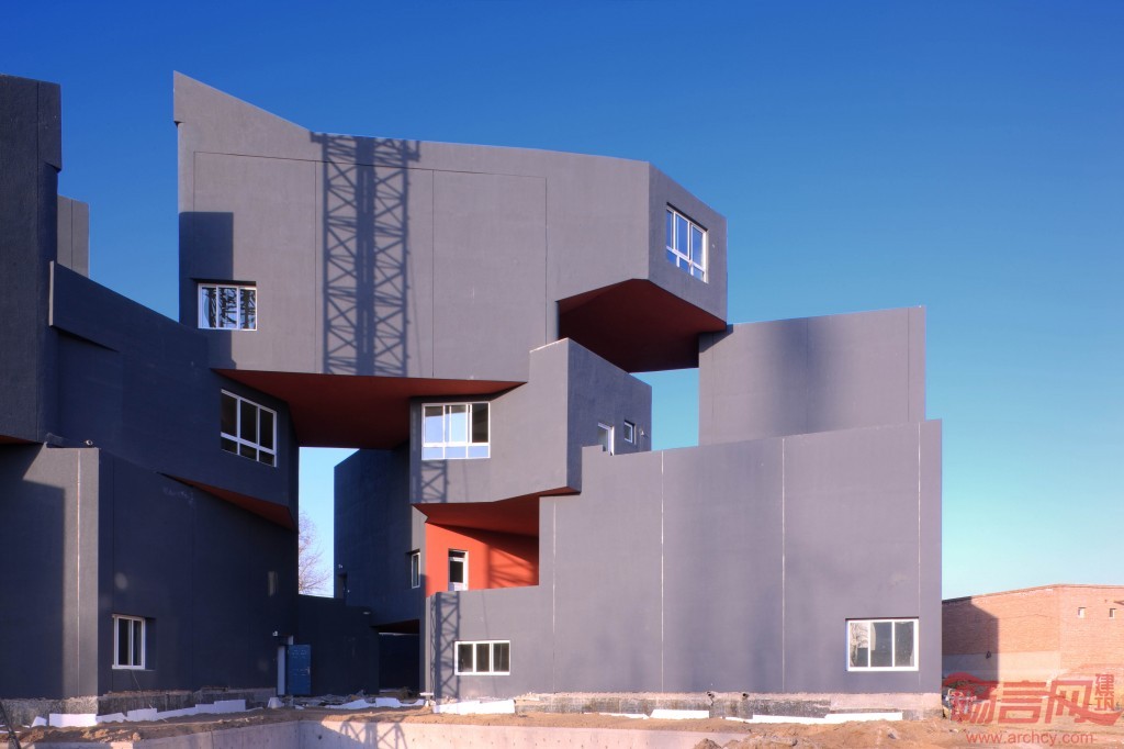 按照工作室的居住和工作两种主要功能,每一个单元都包含两种不同的尺度与组合:工作部分为6米高的简洁的方盒子,居住部分高3米,有一系列几何形空间容纳起居厨厕功能. 体量高差决定了每个单元的工作和居住功能或在同层联系或统过楼梯联系。整个建筑立面采用压型钢板,水平活动平面则是当地典型的红砖。