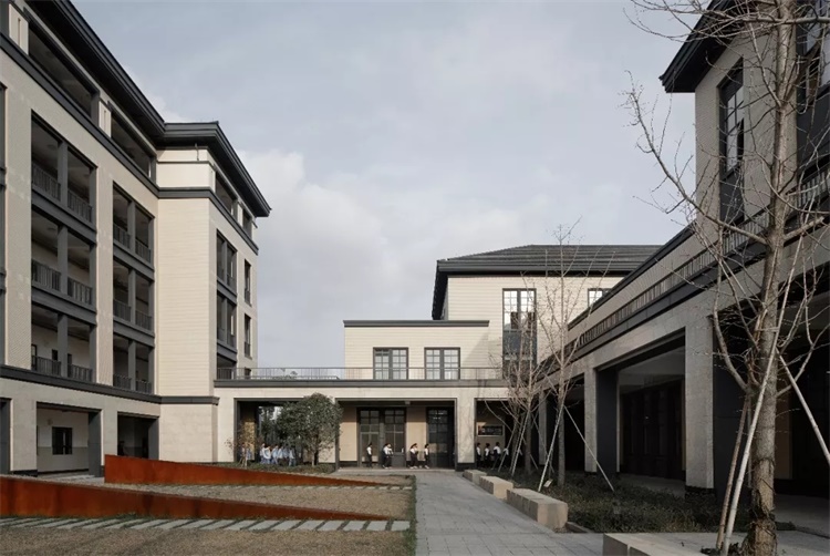 校园建筑风格简洁实用,摒弃浮华造作,体现江南新中式的现代意境。综合区三大公共建筑利用自身的空间变化营造三个不同维度的金属斜屋面,形成错落有致的节奏,大面的实虚对比及富有韵律感的外窗也体现着精致的尺寸控制和立面语言。主要的教学及宿舍建筑利用深灰色屋顶和横向线条营造大气典雅的氛围,经久耐看。