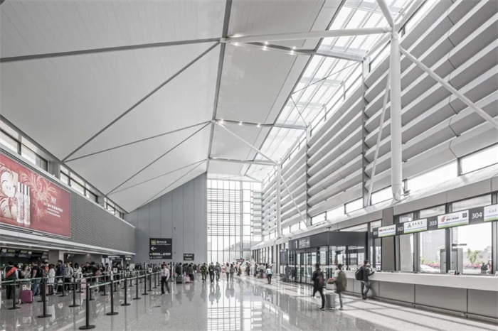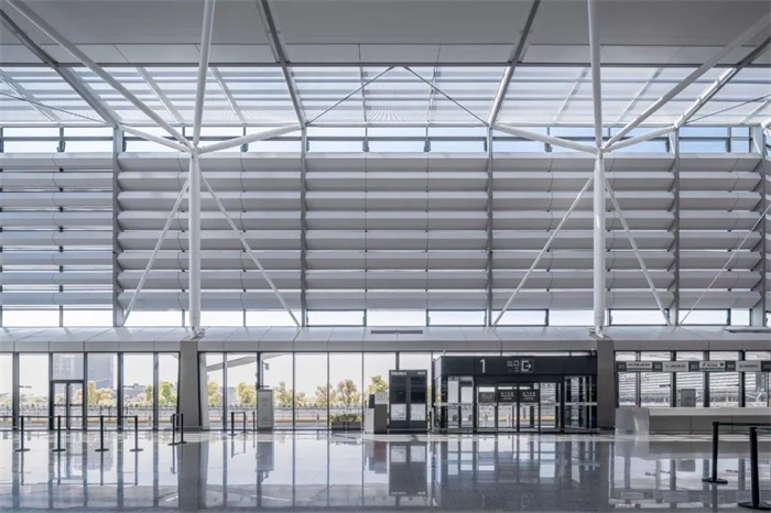 伞形柱、支撑、V形屋面梁等结构以简洁的三角形稳定体系、清晰的受力逻辑,成为空间中的表现要素,营造出精致简约、内敛含蓄的建筑风格。杆件尺度适宜,结构形式活泼,建筑空间有趣,给旅客带来轻松愉悦的享受。