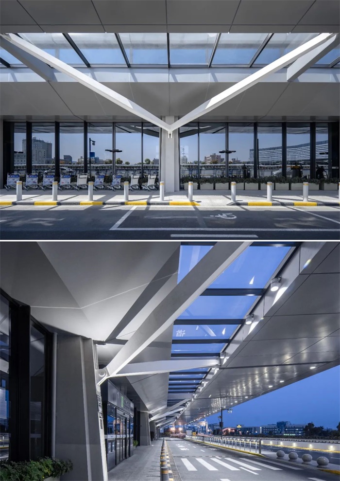 A楼出发大厅高低侧窗形成自然通风,轻巧的天窗结构更利于自然采光,雨棚设置光伏发电板。
