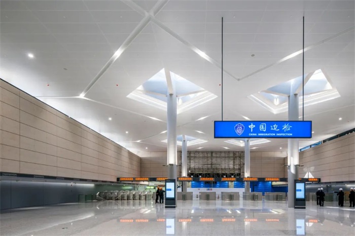 国际联检厅的重载屋面,通伞形混凝土结构形成菱形天窗,通过理性设计营造出举重若轻的效果。基于梁柱节点附近弯矩变化的规律,采用宽度较小的变截面混凝土梁,将弯矩最小处设为最小截面。而此处仍需要传递剪力,因此在混凝土梁柱中设置了型钢,最终实现所见的截面尺寸。