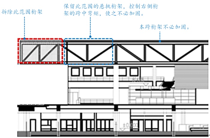 B楼钢屋面局部抬高的方案,保留了作为连续跨的一跨桁架,减小对另一跨桁架受力的影响,减少钢屋盖和柱子的加固,避免更大范围的拆除。