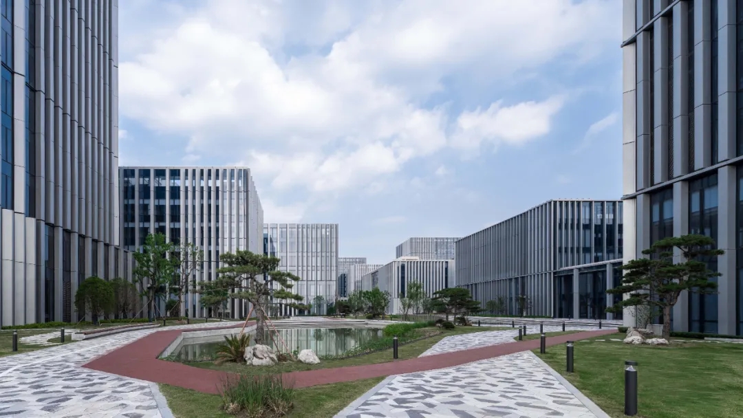 设计意象受苏州拙政园的启发,拙政园以其开阔清朗的景致,多元交织的主题,层次错落的格局闻名天下。gmp的设计将产业园建筑群比作水榭亭台,融入由曲水山池、泉石花影构成的咫尺园林中。建筑组团将园景围合于场地中央,大小相异的建筑体块与景观空间参差交错。纵横其间的交通轴网在建筑和景观间形成多样可达的视觉通廊。建筑、景观和路网三者自然而然衍生出一系列尺度各异的公共广场,可供园区员工与来访者休憩交流。