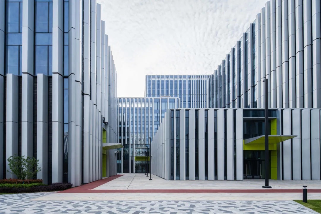 各组团外立面基本构成形式一致,仅在构件疏密组合、纵向分组变化及是否加入水平划分上做出区分,使整个园区的外立面视觉语言拥有高度的可识别性与统一性。如沿园区内外道路行走,目之所及时而通透时而封闭,阴阳虚实,富于韵味,再次凸显了产业园区建筑群统一和谐的形象。