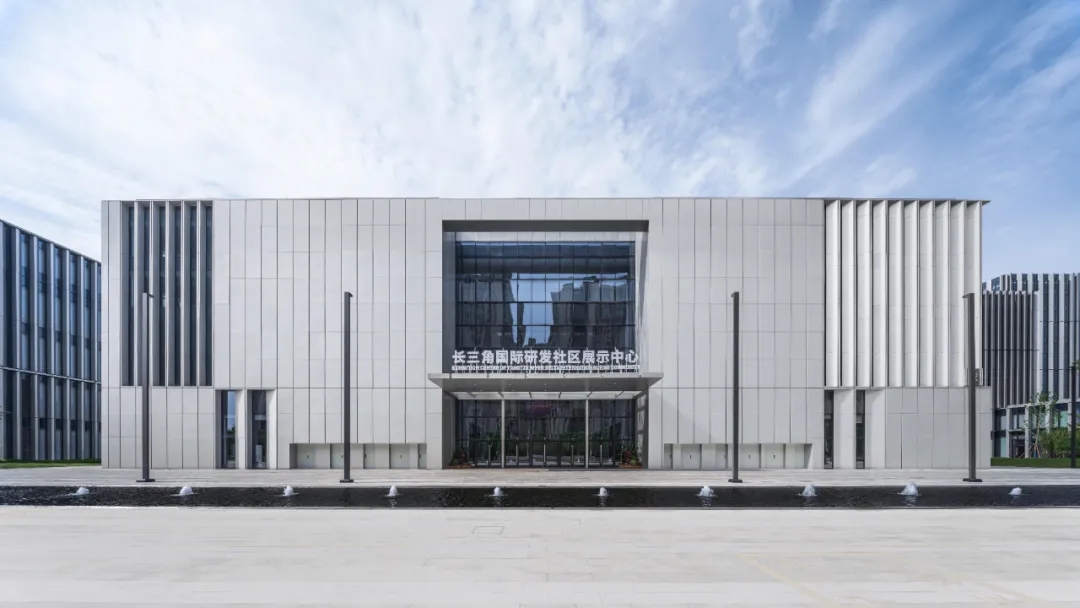展览建筑地处园区南侧主入口,位于产业园的核心区位。三个研发建筑组团、学术交流会议中心位于场地东西北侧,与展览建筑呈环抱之势。