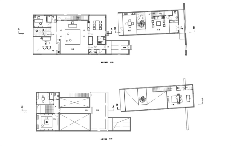 双溪书院的所有建筑单体都几乎全部采用V字形内倾的屋顶形式,这本身也源自平江传统民居院落的剖面关系。这种剖面关系在四分别墅中反映的更为直接。内倾屋面的四个体块成为四个独立的休息空间,体块与外围墙界定的区域即为巷道和公共区域,这种类似聚落的形式也使整个建筑更适应场地,并避免体量过大带来的突兀感。四个独立的功能体块与一个通透的玻璃盒子相互套嵌,产生了居者在室内外不断交互的空间体验;同时,通过围墙的隔挡形成独立的六个小院子,在室内,透过围墙上局部的取景窗洞,使庭院中的人造景观与户外的自然景观形成一个重叠对景的关系。