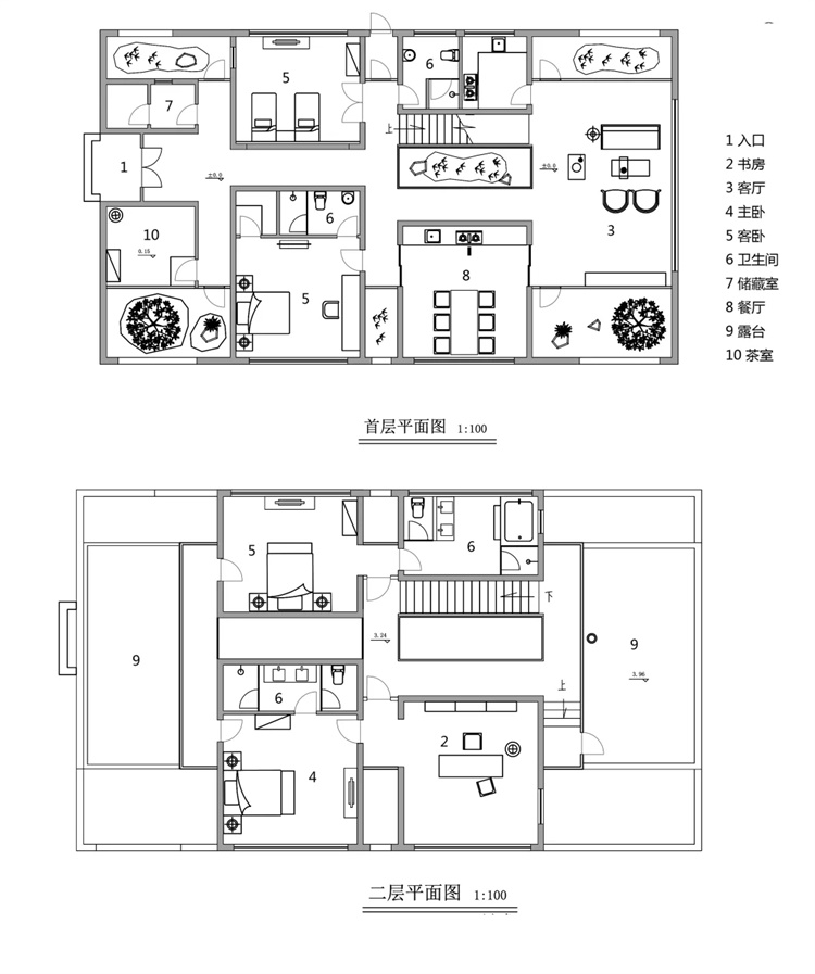 这栋建筑在形态上与山谷客房有着相似之处,即都是迎着谷口的端头立面作为建筑的主立面,而主要的体量则隐匿在谷中。建筑随着山谷地形走势呈现折线关系布置,一层有三个独立的单体“盒子”,主要为公共活动空间,穿插其间的是几处半户外的“亭子”空间。这些空间由一条边廊连接。二层为卧室等私密空间,成线状排布成一条通长的“廊桥”结构,连续的竹钢格栅立面增加了“廊桥”在结构视觉上的整体性。在实际的功能划分上,多数使用状态下二层的卧室等私密功能是独立分割的;只在必要时可以通过二层的走道相连接。屋面三角的折面关系使整体形态更相似与传统坡屋顶的意向。