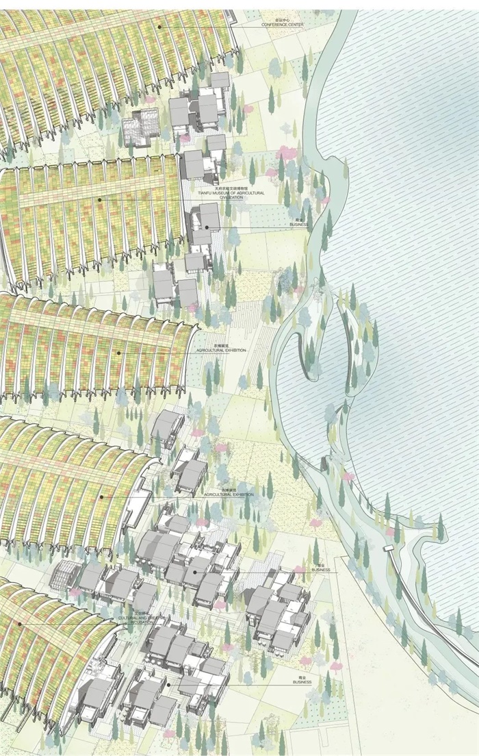 项目摒弃传统封闭型行列式的会展模式,采用“指状”与田园景观互相渗透的布局方式,将室外展场分散布置在建筑周边的林盘特色空间中,形成“田-馆相融”的展会空间模式,实现田间地头办农博的基本理念。