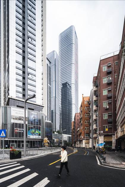 整体设计秉承“将空间还给城市”的理念,沿建筑界面小心翼翼地去处理,考虑和周边环境的关系,退让出舒适的灰空间、营造出有趣的各级广场、布置特色鲜明的下沉庭院,鼓励多元社交、激发社区活力。并通过与国际设计与艺术团体的合作,将艺术带入城市,和旁边的古村落产生了新对话。