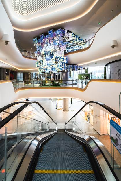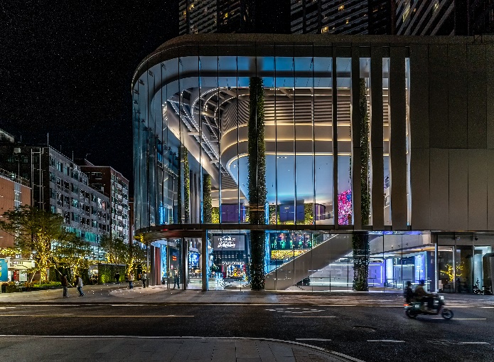 C Future City的商场明快、鲜活,沿商场主动线上,排布尺度宜人的中庭,预留出不定期艺术、商业等表演展览的活动策划空间,为消费者营造出体验艺术与潮流的好去处。同时,为了将商场主入口尽量做到“透明”,技术方面采用12米通高的玻璃肋幕墙系统,并通过吊挂的方式,尽可能地建立室内商演空间与外部环境的视觉联系,提升来往人群与建筑的互动。