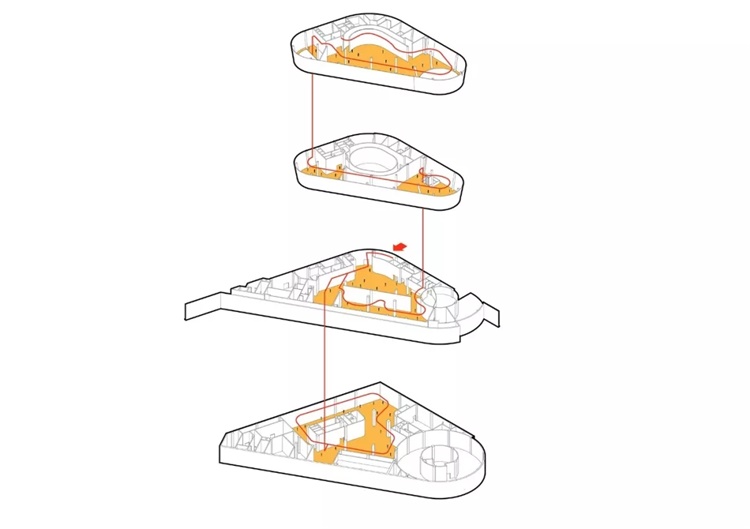 设计通过周边场地步道的延展和建筑自身形体的处理,将或在此交汇的四股人流——博物馆的观展人群,江河汇商业客群,运河游步道人群、钱江新城江滨步道的公众,通过盘旋而上如水漩般的公共步道,引导至24米标高处的博物馆屋面,通过空间上的抬升和视野的延展,鼓励人们探寻不同空间高度和维度上的视觉观感与城市风景体验。