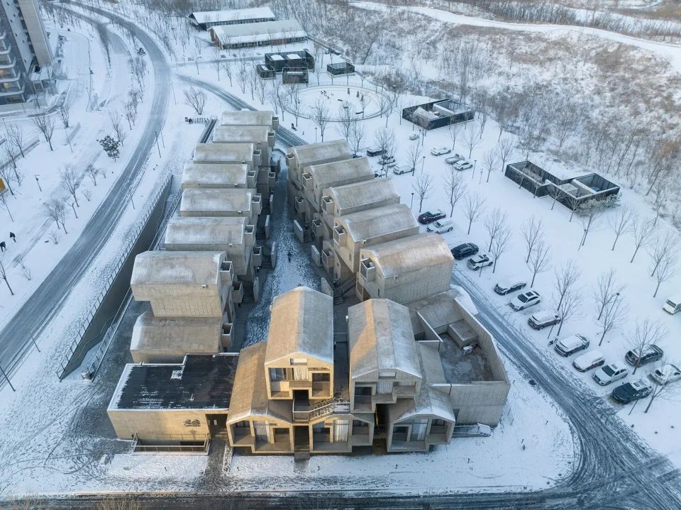 后来综合两种模式的特点设计出了一种错开的叠合模式,上下一共三十个盒子,出入口互相独立分开,这样除了解决了这个狗和狗的过多相遇的问题之外,还创造了非常不同的建筑造型,同时拉开的房子之间处理成楼梯并提供地下室食堂的自然采光。在盒子另一侧,因为有进有退,所以部分客房为了避让楼梯就产生了跌级的立面造型,同时也为客房室内的跃层楼梯提供了基本骨架。