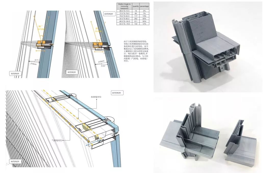 对于扭曲较大的双曲面超高层而言,其拟合双曲面一直是一大难题。Aedas设计团队与RFR通过深度合作,以复杂曲面幕墙BIM和双曲幕墙单元的玻璃冷弯技术攻克了这一挑战。独创的幕墙系统能适应单元板块多角度、多尺寸变化的要求,确保建成效果与模拟效果高度一致,并保证幕墙性能。而采用三维组框+平板玻璃冷弯设计的玻璃单元,以打破国内最大单元玻璃翘曲量的86mm让设计得以实现。整个过程真正做到了从整体几何优化分析、幕墙模型建模、LOD400加工图深度构建建模,到加工图数据自动生成和检查的全过程幕墙BIM流程。