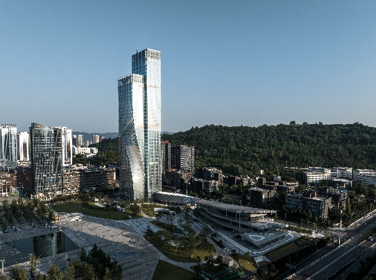 在建筑布局上,设计充分考虑到建筑体量与城市环境的平衡,让超高层塔楼退让至商业零售裙楼左侧,既避免了对地块东北侧照母山上揽星塔的视觉遮挡,又消减了对城市中轴线的高度压迫,同时也创造出了更多市民户外活动空间。项目以其标志性的建筑轮廓,和为城市提供的重要公共活动空间,将成为极具辨识度的新地标。