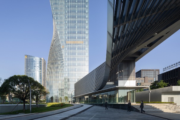 “项目面对广场这一宽阔的开放空间,本身具备成为标志性塔楼的有利条件。而大扭拧角度的幕墙可以在第一时间抓住所有人的视线。”Aedas全球设计董事韦业启(Ken Wai)从极光这一绚丽且灵动的发光现象中汲取灵感,将办公塔楼南侧与东侧立面顶底相连,以独特的双曲面模拟极光弧幕状优美的姿态,上演一场“光之舞”,从不同角度可以欣赏到不断变化的曲面形态。