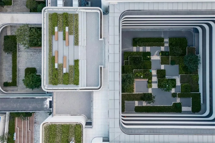 西侧教学区围绕一座内向庭院布置,为孩童提供庇护感和安全感。在庭院中,孩子们的奔跑被放慢。建筑师将庭院切割为像素化的小尺度,并赋予其标高变幻,起伏的台地上遍植绿植,引导学生用身体感受环境中蕴含的丰沛信息,在潜移默化中建立对于四季和自然的感知。