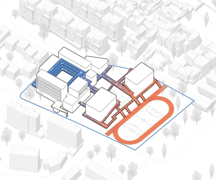 在建筑师的蓝图中,顺着这一愿景,学校的运动场、图书馆、食堂等设施将经由祥符直街与商业及滨水空间串联,共同构成一组完整的公共空间系统。