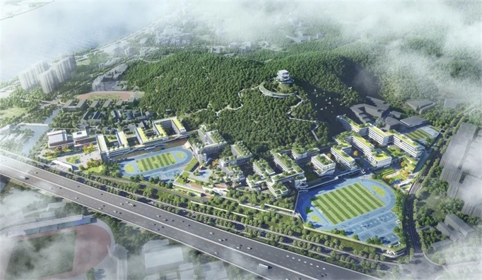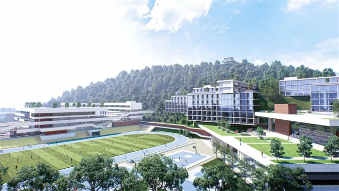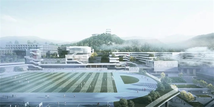 本校园依山而建,将山景与自然融入校园与教学之中,设计利用山地环境的丰富性,强调建筑与环境的融合与对话,形成了丰富的山地自然与人文规划空间效果, 设计理念以山为图底,校园的规划与设计与山地背景融合,成为一副优美的现代建筑山水画卷。