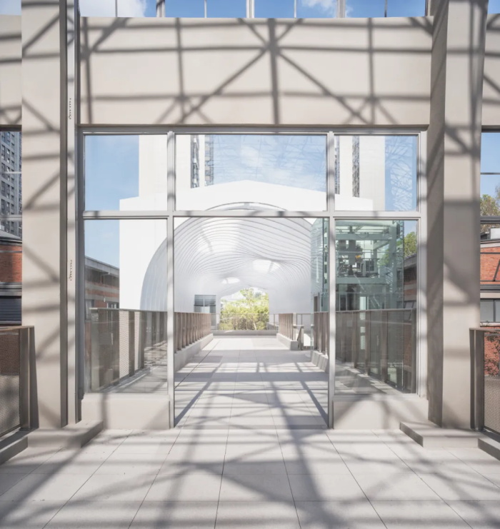“云影”轴线串联了社区服务、文体活动、菜场、育儿园、医疗、养老等功能,成为多样化活动的“云”空间。与原有工业厂房坚实利落有逻辑的建筑性格形成鲜明的对比,新与旧,轻与重融合穿插,为周边居民们创造更多美好的体验。