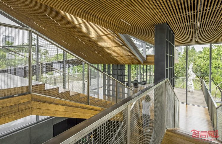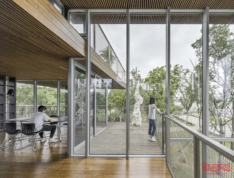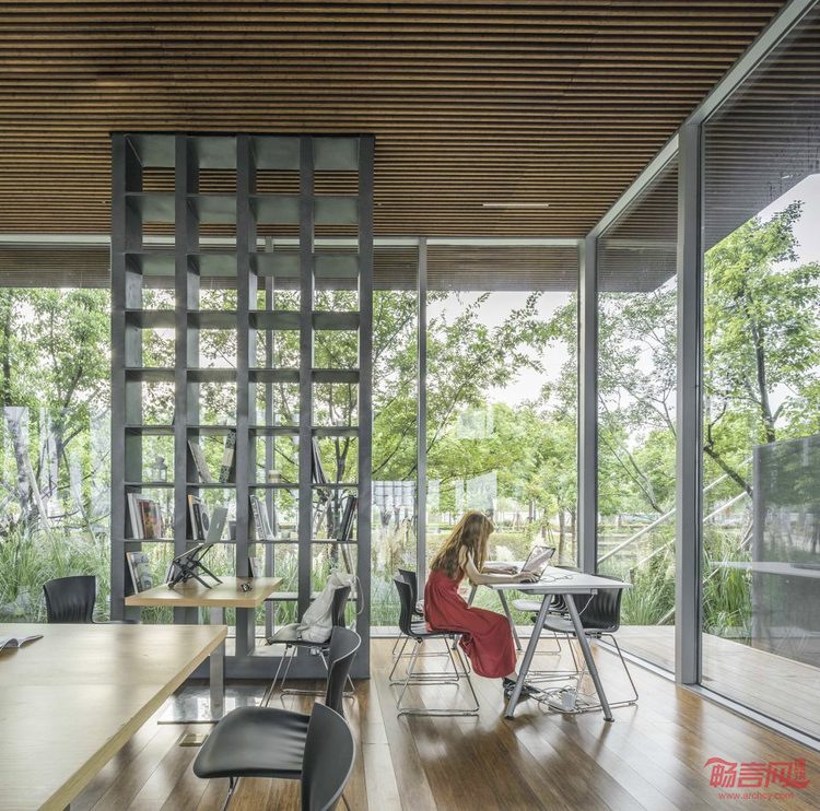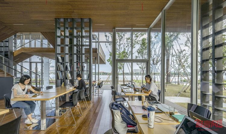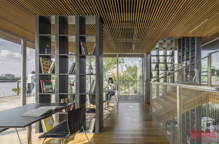 建筑内部的空间虽然是完全贯通的,但却藉由错落的平台和格架墙形成了不同气氛的室内空间。入口的通高空间成为门厅,四步之上的第一平台是空间动线的枢纽,连接门厅、楼梯、首层的室外平台,并提供咖啡售卖服务;沿楼梯拾级而上,依次错层的三块平台提供了相对内向的空间,使人能够静心阅读。在书屋里,书架既是支撑结构,也是划分空间的墙,朝向不同的格架墙在室内可以指引路线和限定空间,人的视线会被格架上的书本吸引或被导向室外的风景。使用超白中空玻璃的幕墙增加了书屋的通透性,推拉门的轨道被处理成与室内外楼面齐高,模糊了室内与室外的界限,让人在室内外可以感受到平台和格架墙形成的丰富的空间层次,这种渐次引伸的层次在内部的人与外部的风景之间建立了能够感知的关联。到了书屋顶层,放宽的楼梯可以成为小型聚会和演讲的场所,而顶层的户外平台,又是通往屋顶露台的坡道起点,室内的活动可以一直延伸到开放的露台上,享受壮观的江景。