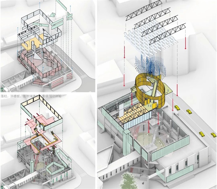 改造策略一:“蛇形艺廊”,串联城市公共空间,将文化艺术注入日常社区生活。设计方案将原本封闭的影剧院界面打开,形成贯穿渔村路、街角公园、文化广场的公共城市通廊。影剧院转变成一个“开放”的建筑,喧闹的市井生活得以融入建筑内部的艺术文化空间,形成高品质的城市生活体验。