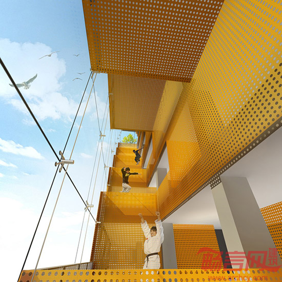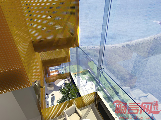 结合功能业态定位,在总部办公、酒店式公寓、公共活动设施(会议、商业)三大部分之间,这种环型的公共空间中容纳本建筑中最为混合多变的功能类型,包括品牌展厅、康体健身、咖啡厅、书吧、植物园等,在建筑内部创造出一系列的有趣味的都市生活,避免了过去高层办公楼那种各种功能严格划分的方式。当用户进入这个观景台似的开放空间,迎接他的将是生动的景观和良好的自然采光设计。“3D公园”包含8个不同高度的转角中庭,最大限度的提供了建筑与城市视野的丰富性。