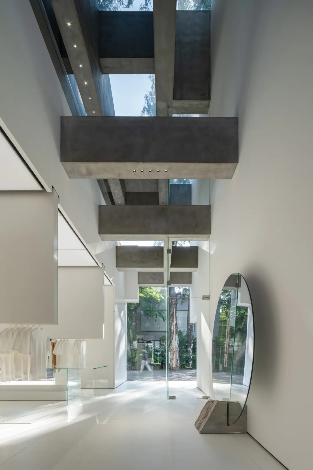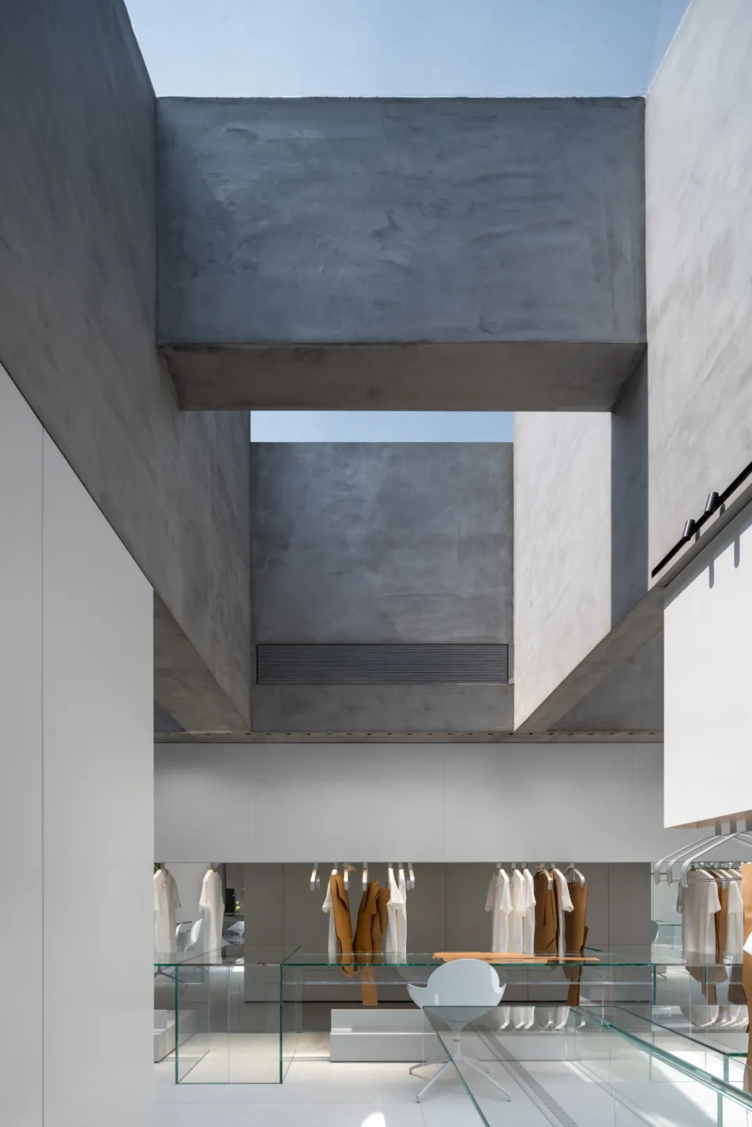 ZS是一家专注于纯白(黑灰)T恤卫衣品类的新品牌。在产品技术层面深耕于面料科技,版型,车缝收口。这种产品逻辑十分具有建筑感,也自然成为我们在该项目建筑空间建构技法上的原则。