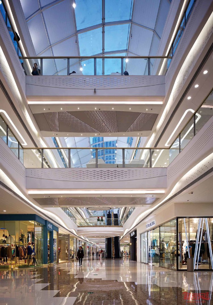 步行街,自动扶梯的类似水体的线条形成一个流畅的上游流,汇集到水滴般的天桥上;中庭、侧裙与天花作为一个整体设计,双层的曲面表皮由侧裙逐步过渡到天花底部,舒展而大气。表面渐变效果的透光图案,在夜晚形成了柔和的曲状排列的波点,环绕在中庭各层空间。