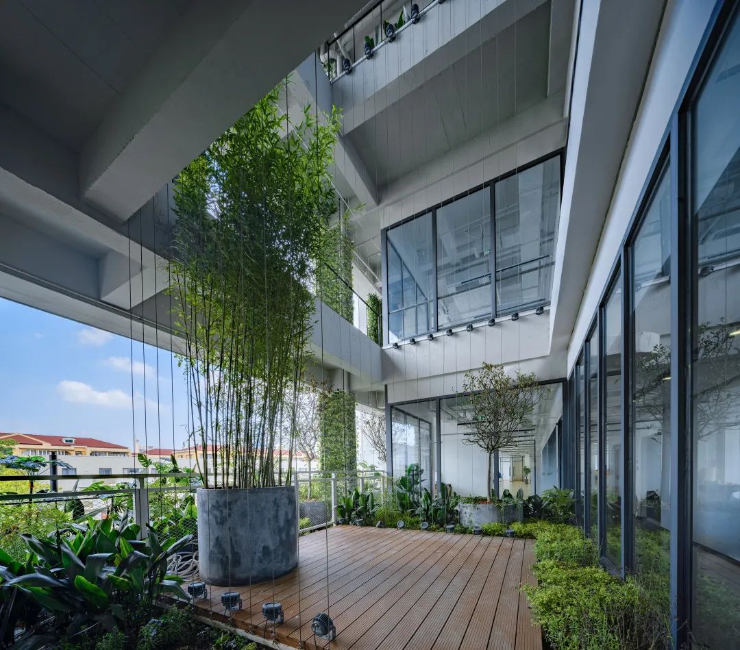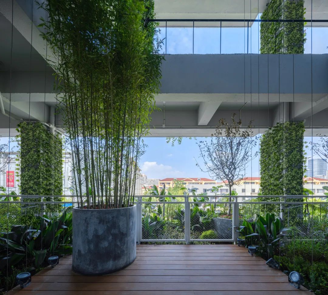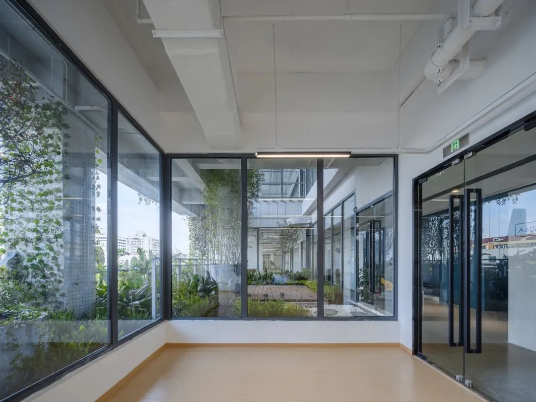 因此设计师首先对建筑重新进行了比例分割,将长长的体量切分为三段,把建筑中部两个原先被玻璃封闭的露台区域完全打开,置入两处“绿谷”连接三段体量,以绿植形态形成“呼吸空间”,并延伸至屋顶花园。
