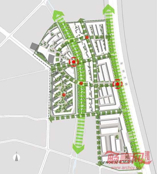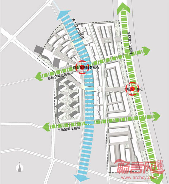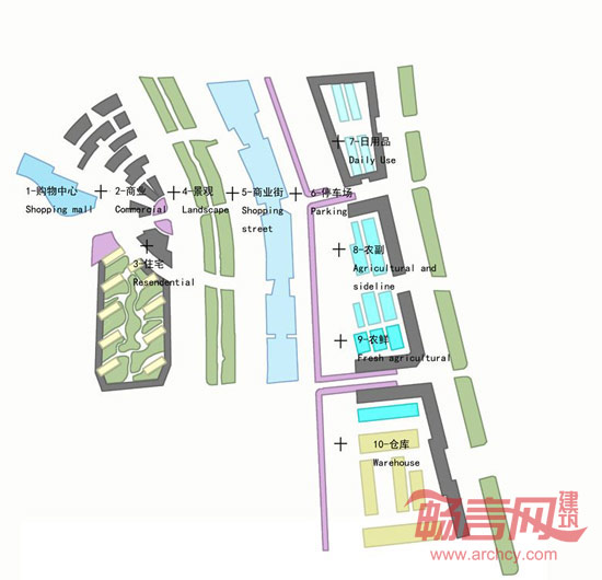 在该区的整体规划中,我们新增了人行流线,即在市场与住宅商务区之间新建了一条步行通道,地块中央有一面湖,另外还建有一条绿色廊道,这些都成为了吸引该区居民的特殊亮点。总体规划的功能包括购物中心、商业街、住宅和农贸市场等。