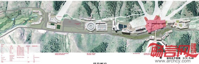 本项目建于山区,地形高差复杂,建筑设计顺应地势,设计了不同标高、不同大小的广场、露台、庭院、减少了工程的土方量,同时形成了丰富的室内外空间,使室内外空间自然渗透。建筑立面采用大面积落地玻璃与文化石、仿古砖饰面的虚实对比,屋顶采用金属坡屋顶,极具山地建筑特色。