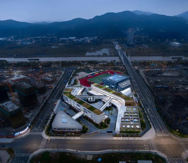 形体的塑造,暗自呼应了周边山的形态,两座教学楼之间的庭院,也像极了山间的峡谷。由低向高自然退却的露台,如同绵延上升的山体,成为学生课间活动的主要场所,同时也勾勒出更加广阔的天空形状。