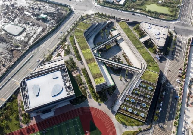建筑屋顶在面向城市和山景的一端,切削为放大的斜面,施之以错落的连续台阶,自然成为面向外部的看台。绿植也由地面蔓延到屋顶,成为两道掠过场地的绿光。散布其间的采光玻璃窗,如同绿野中的宝石,在白天和黑夜熠熠生辉。建筑此时不再遵循内敛的自我秩序,而是放弃自己的壁垒,融入城市,成为区域独特脉络的建立者。