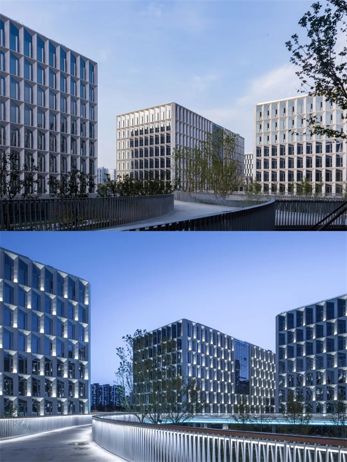 低密度办公园区建筑往往呈群体组合趋势,体量多且小,在形式设计时,需要谨慎考量好“统一”与“差异”之间的平衡,在大尺度上形成群体效果,在中观尺度上体现差异,形成“和而不同”的效果。