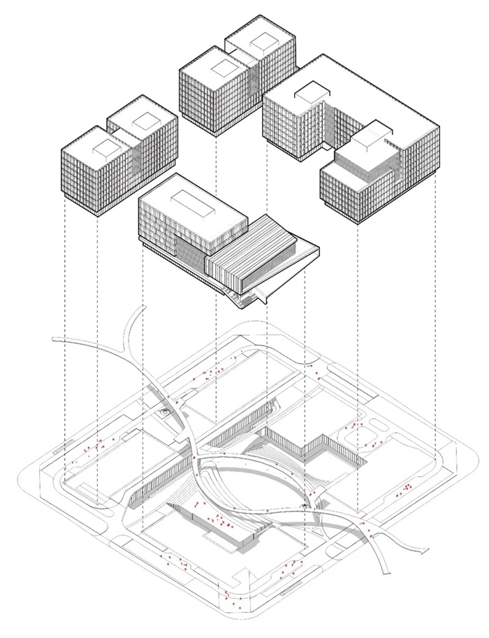 地块内采用人车分流的交通组织模式,建筑外围设置车道和落客空间,建筑内侧围合形成大面积景观庭院,形成纯步行化景观空间。同时结合园区规划的如意台二层慢行系统,穿行其间,串联起各个小空间。局部结合人工堆叠的景观坡地及串联起来的下沉庭院,将地下一层、首层及二层步行体系有机结合。