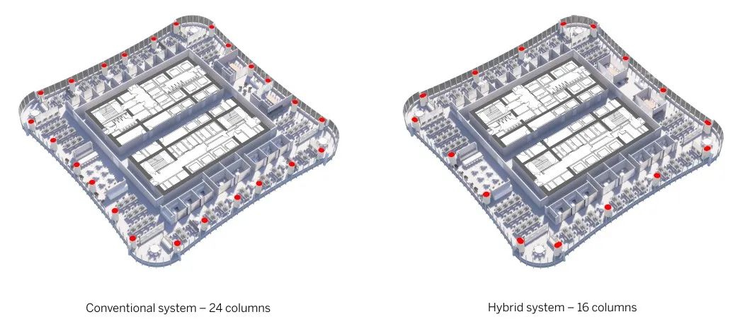 与传统高层建筑的框架结构系统相比,宁波中心塔楼柔和、有机的斜交网格结构的自然收分处理,打造出结构柱数量自下而上自然递减的效果,并尽可能减少了大部分楼层的结构柱数量,有利于实现更为开敞的楼板,获得更佳的视野,实现室内布局的灵活性。
