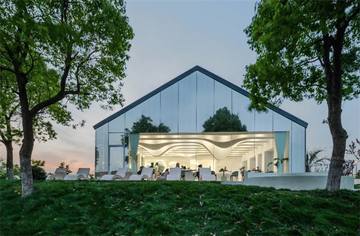 项目原是公园内的一处木质剪力墙结构的配套用房。作为太湖新城的核心, 公园希望通过对原有建筑的改造,给予周边居民及外来游客服务的休闲聚集点。不论是在挥洒过汗水的运动后,还是在滨水漫步的午后,都可以在此休憩、用餐和聚会。形体的设计基于原有木制建筑的结构,错落穿插的体块生成了丰富的内部空间。白色的穿孔板与大面积的落地玻璃也被运用于设计中,形成了对内和对外两个不同的立面,一面朝向太湖,反射的效果令这个体量不大的建筑充分融入周围环境,让建筑映射人和城市的表情。一面朝向球场形成庭院,同时与公园以及场地建立紧密的关系。
