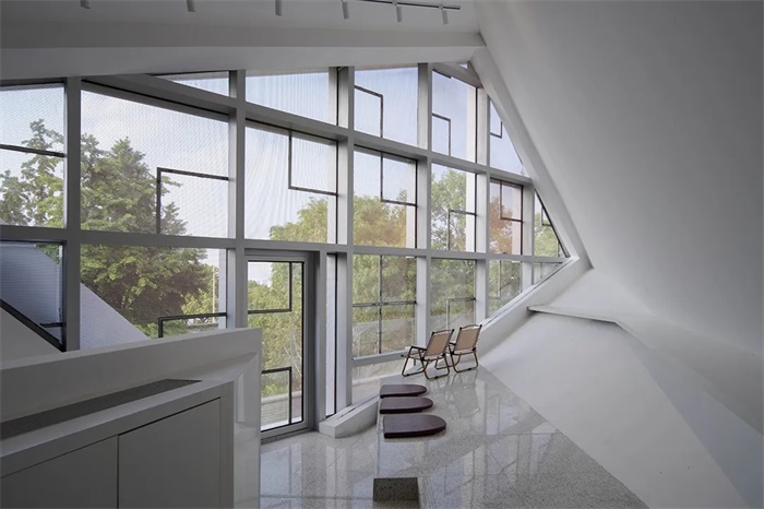 地形设计上运用单纯的草坪地坡,加以形象树的烘托,突出了建筑雕塑感和存在感;绿植和草坪,有机地从基地中生长,并以单纯的几何体与自然环境对比呼应。