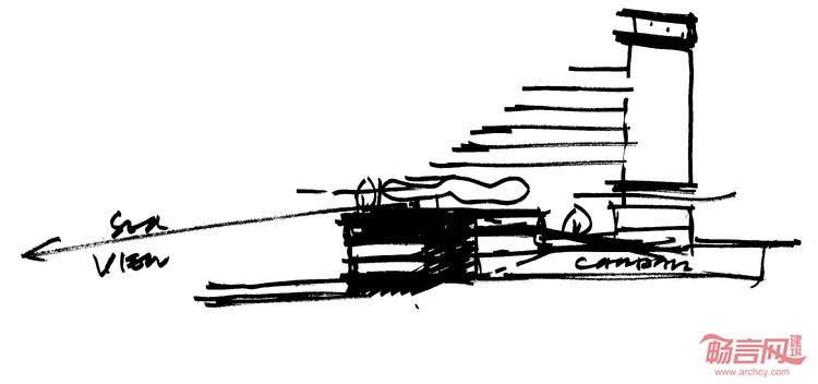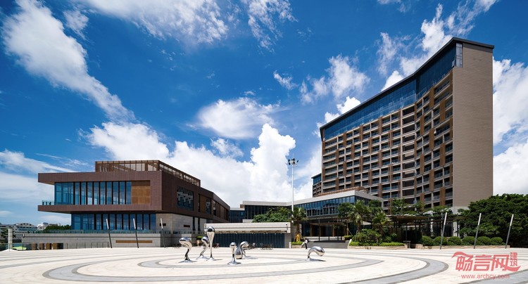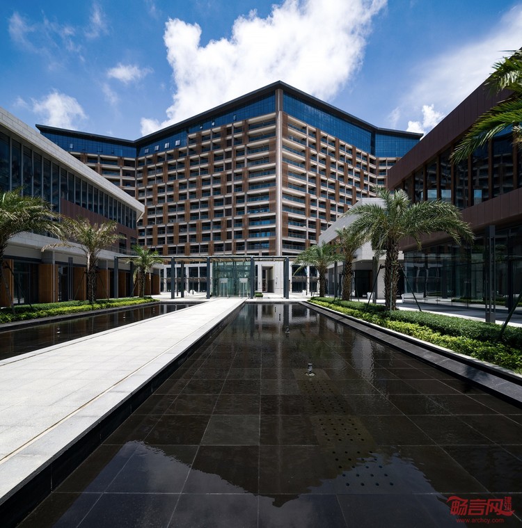 酒店屋顶的“之”字曲折造型打造出生动有趣的海滨天际线。酒店立面采用开放式走廊循环系统,改善走廊自然采光和通风,避免传统酒店走廊封闭和易迷路的缺点。立面上设有间隔随机的铝制仿木格栅,增加了建筑的有机格调。设计特意将餐饮区置于滨水位置,享有引人入胜的景观,与酒店一起成为浑然一体的背景幕。