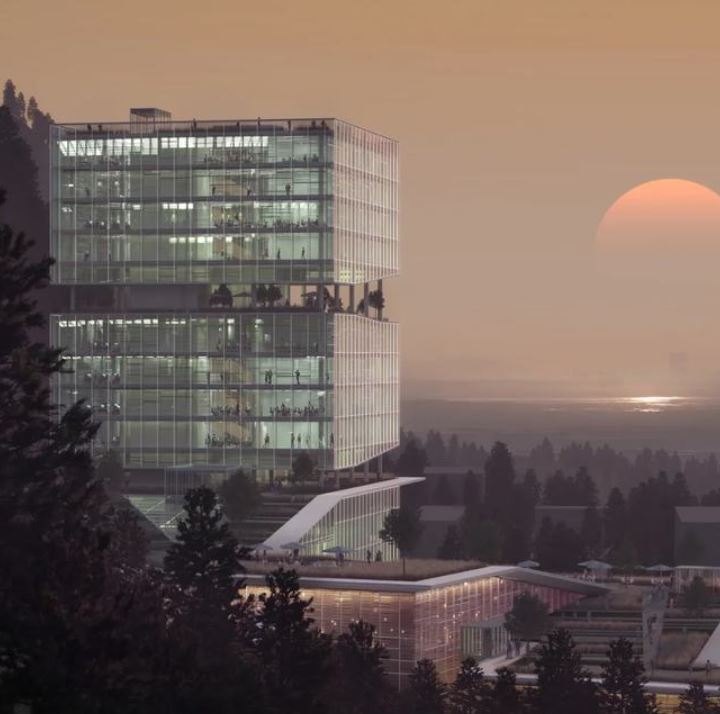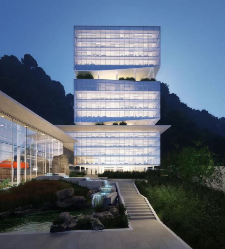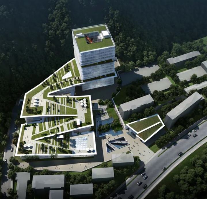设计从人性化的角度出发,不仅在裙房部分设置了斜坡屋顶空间,同时在办公中构建了空中花园。一方面花园可以为办公人员创造出交流休憩的场所,另一方面也能将南面老和山的景观渗透至城市中,并且与西溪湿地遥相呼应。