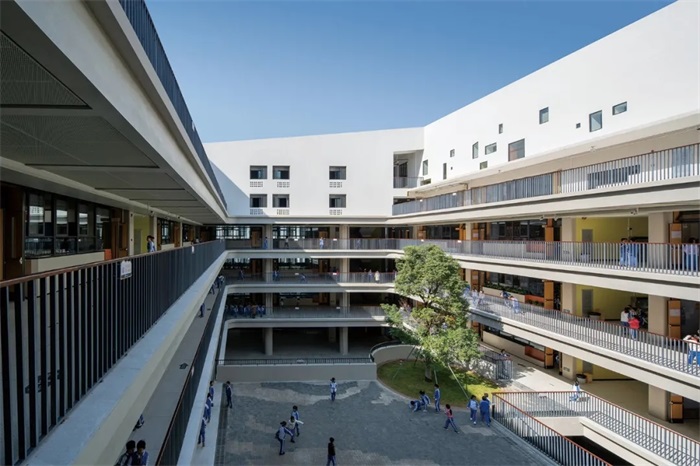 建筑师延续了研究室“都市合院主义”设计系列,通过石厦小学的设计,进一步探讨四合院的人本精神和景观生态,如何在多层高密度的条件下,维系合宜的空间尺度,调控建筑与自然的交错,让小孩与院落、大树与草地一起成长。